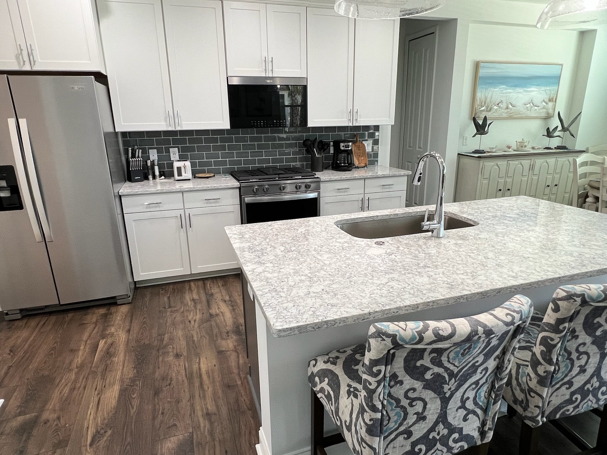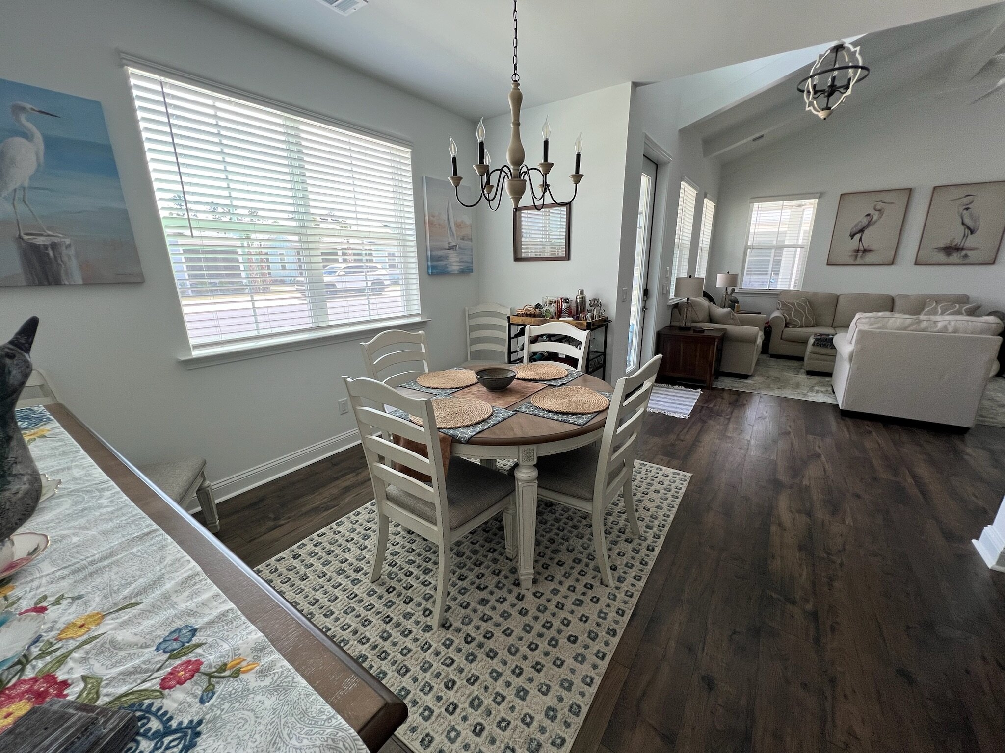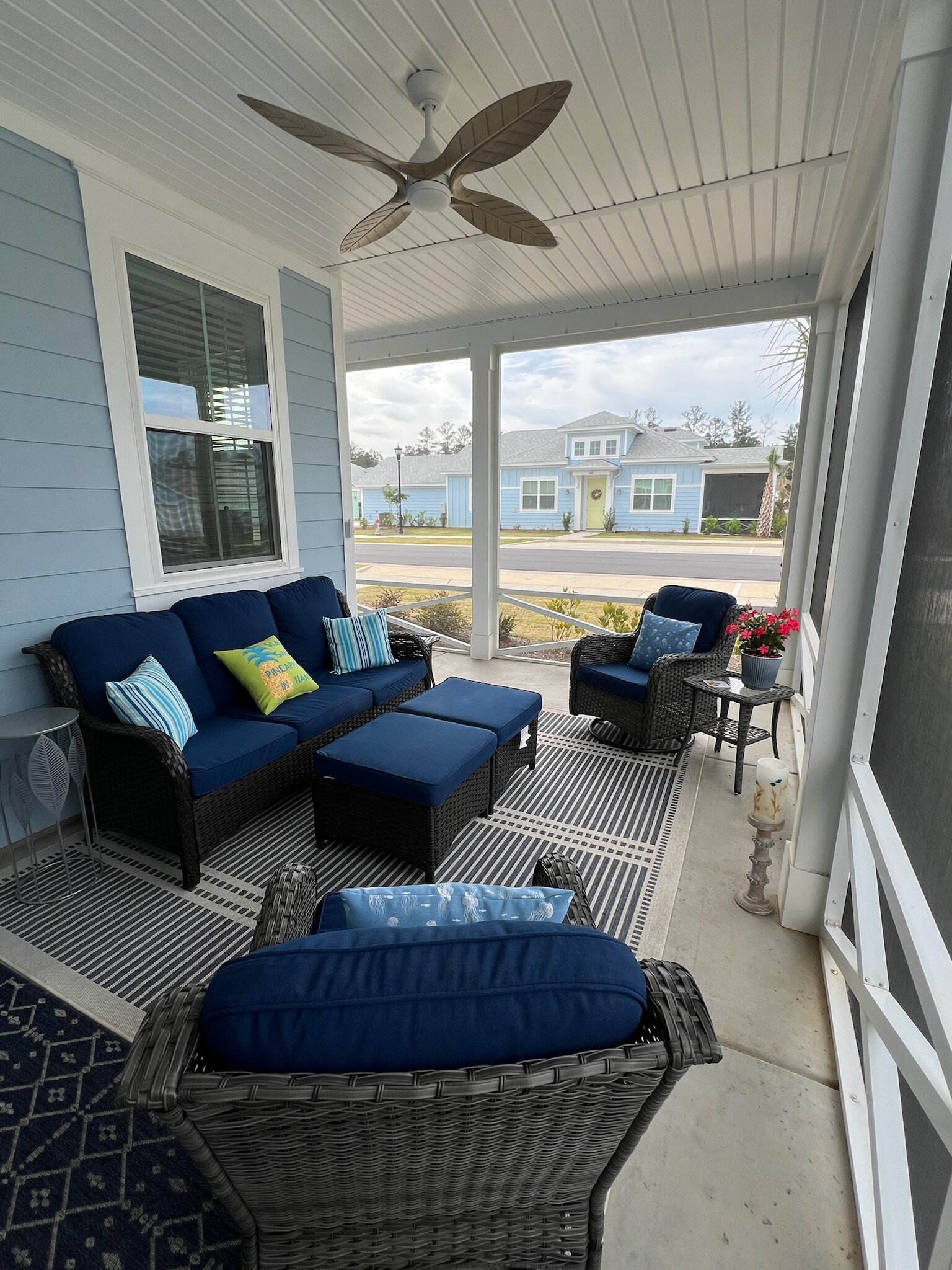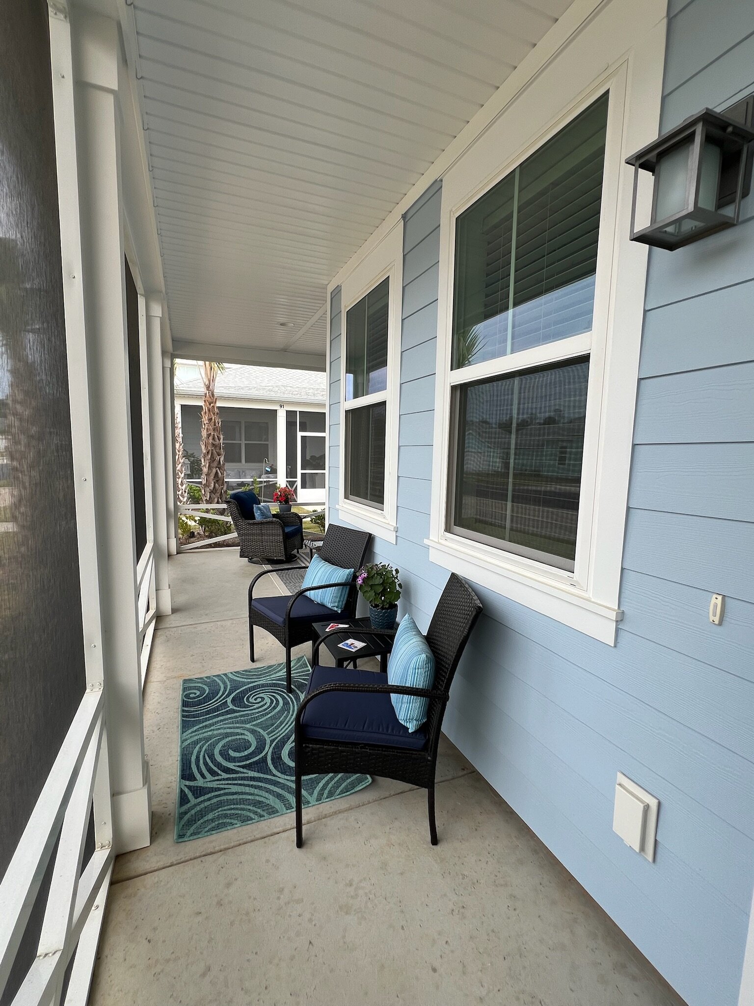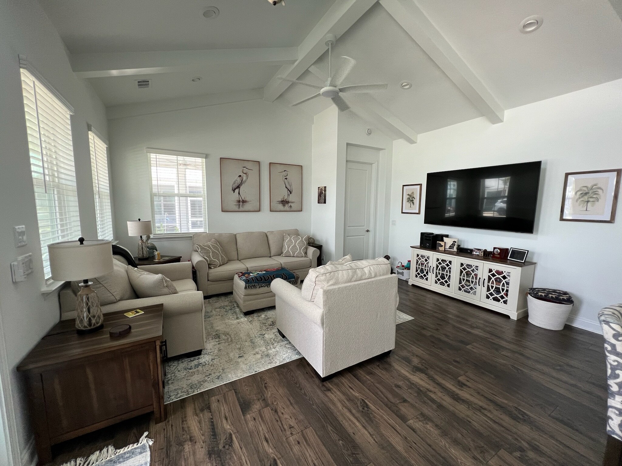 Our cottage is the Dreamsicle model, which provides 1,383 a/c sq. ft. (2,098 total sq. ft.). It has two bedrooms and two baths, an office/hobby room, laundry/mechanicals room, and an open floorplan consisting of a family room, kitchen and dining area. In addition to the open floorplan, the feature that drew us to this model is the L-shaped lanai, which we had screened in as an option during the construction process. Other options we added include upgraded gas appliances, beams on the family room ceiling to define the space, Mohawk laminate flooring throughout, quartz countertops, additional recessed lighting, and 8-foot doors. We had a local electrician install dimmers on our kitchen, dining room, family room, and lanai lighting. He also installed five ceiling fans and other lights for us.