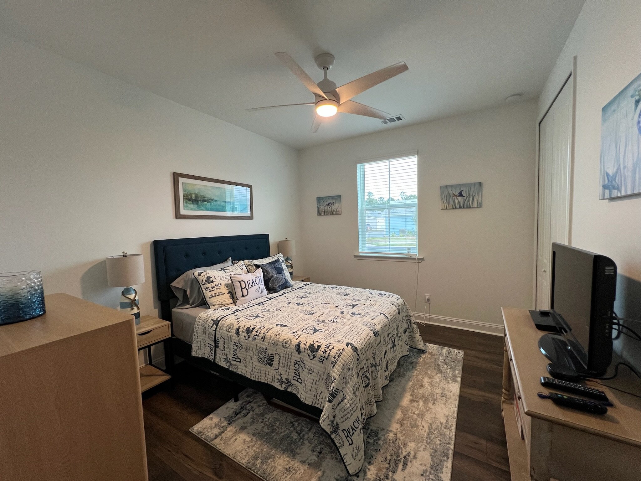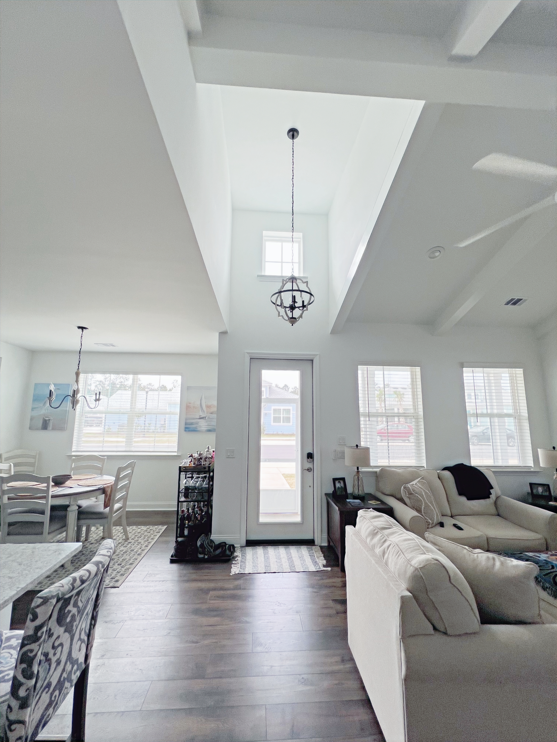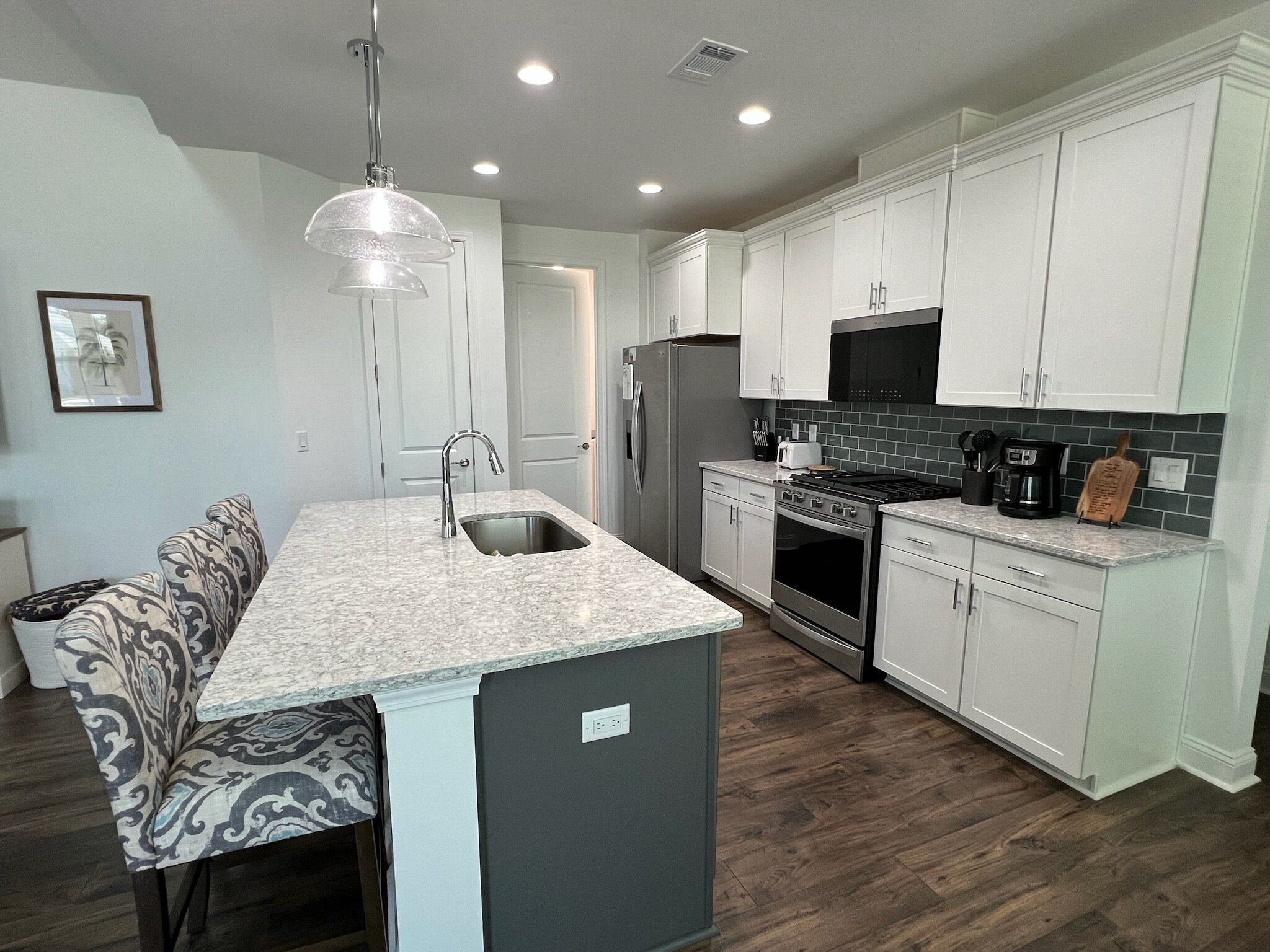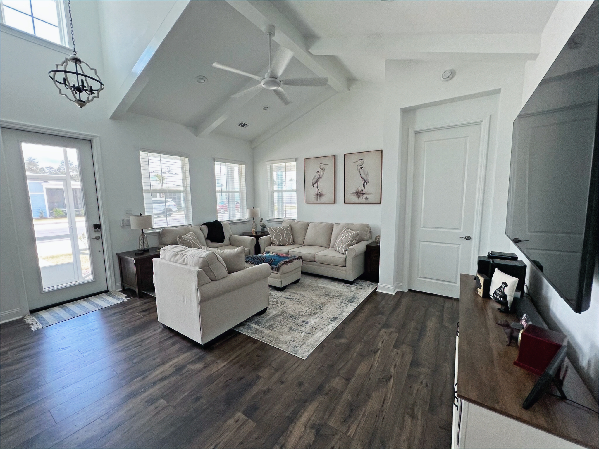 Our cottage is the Dreamsicle model, which provides 1,383 a/c sq. ft. (2,098 total sq. ft.). It has two bedrooms and two baths, an office/hobby room, laundry/mechanicals room, and an open floorplan consisting of a family room, kitchen and dining area. In addition to the open floorplan, the feature that drew us to this model is the L-shaped lanai, which we had screened in as an option during the construction process. Other options we added include upgraded gas appliances, beams on the family room ceiling to define the space, Mohawk laminate flooring throughout, quartz countertops, additional recessed lighting, and 8-foot doors. We had a local electrician install dimmers on our kitchen, dining room, family room, and lanai lighting. He also installed five ceiling fans and other lights for us.