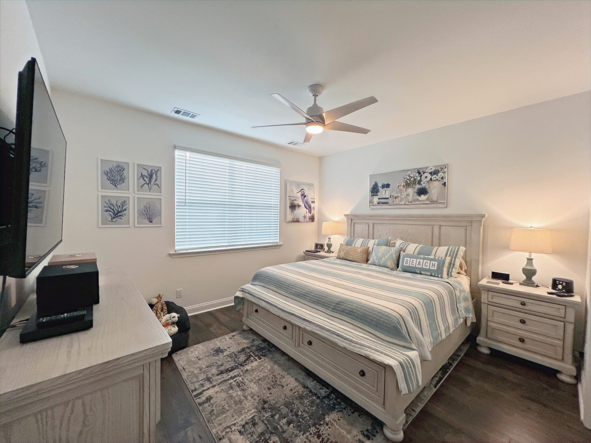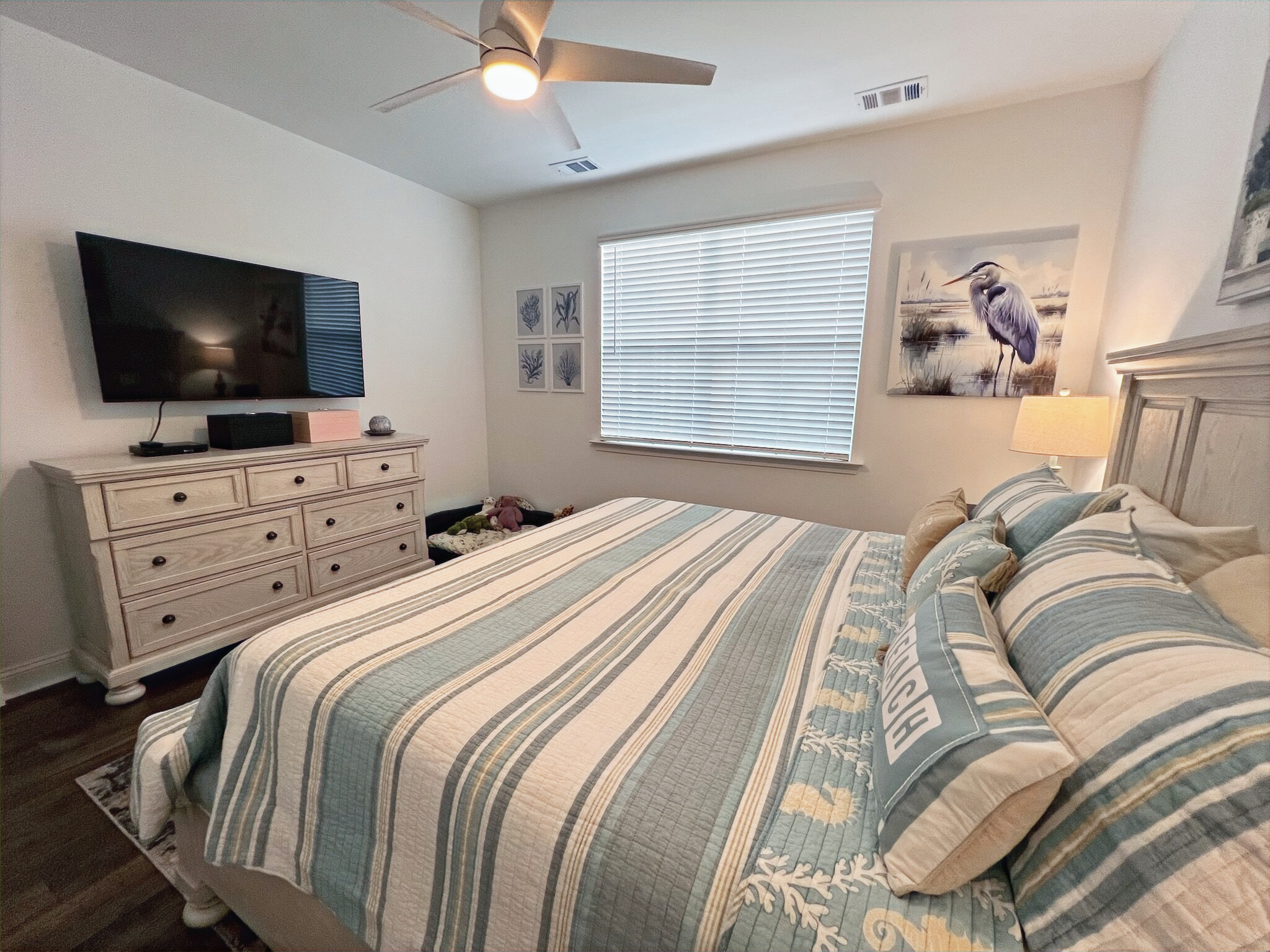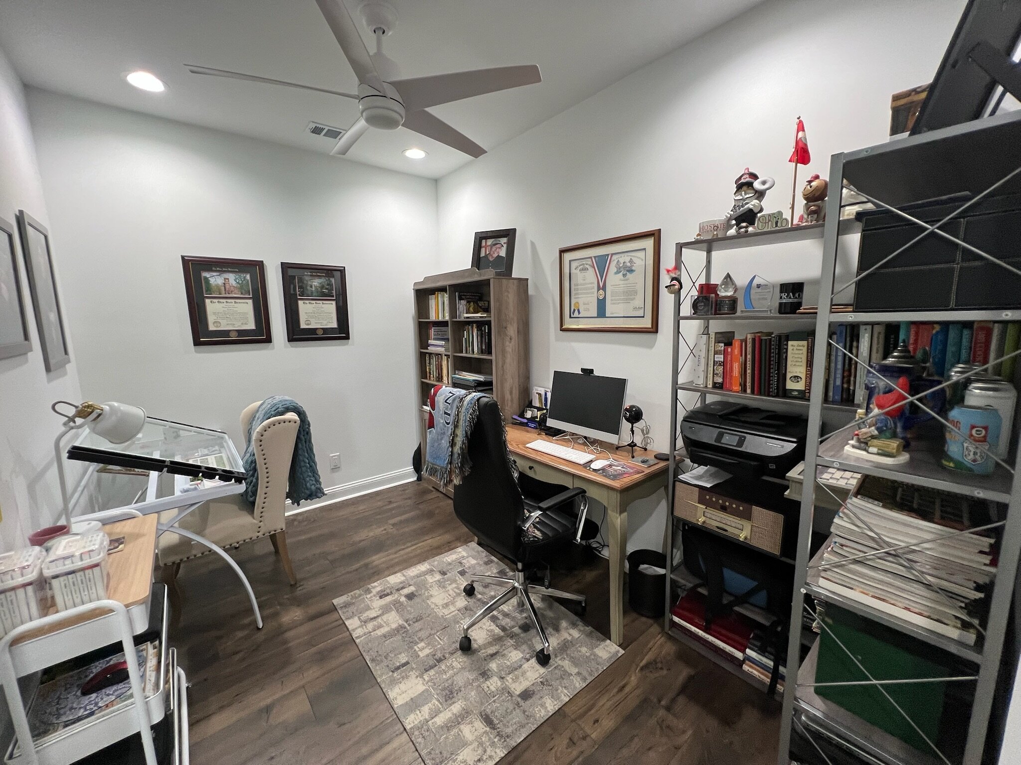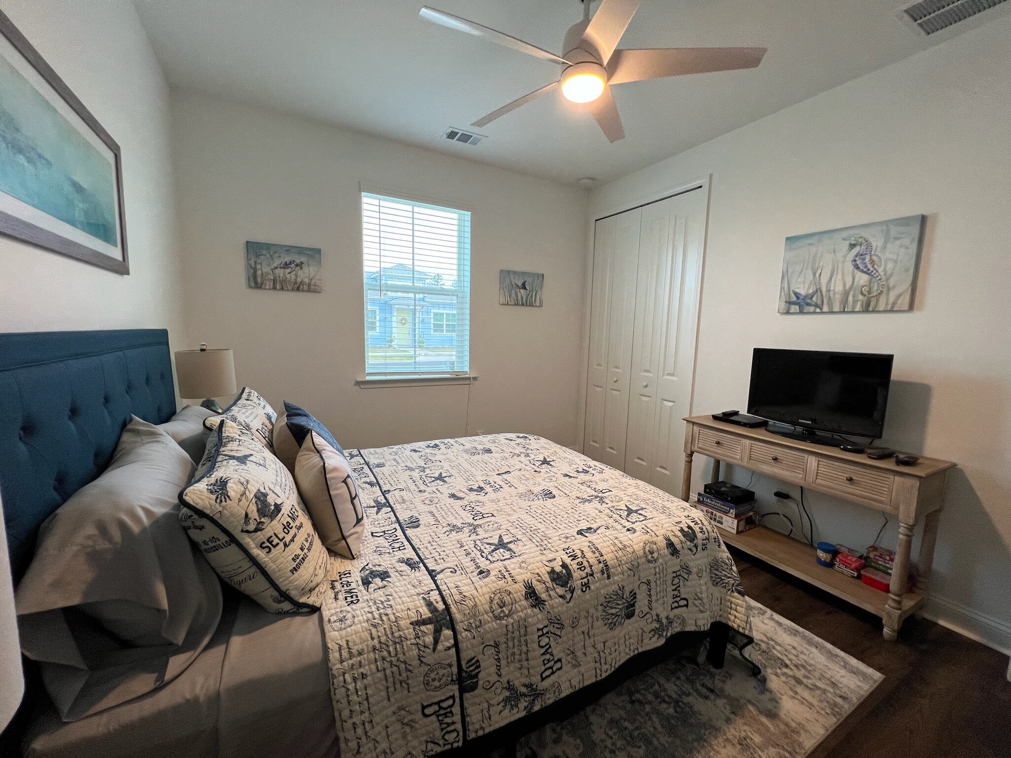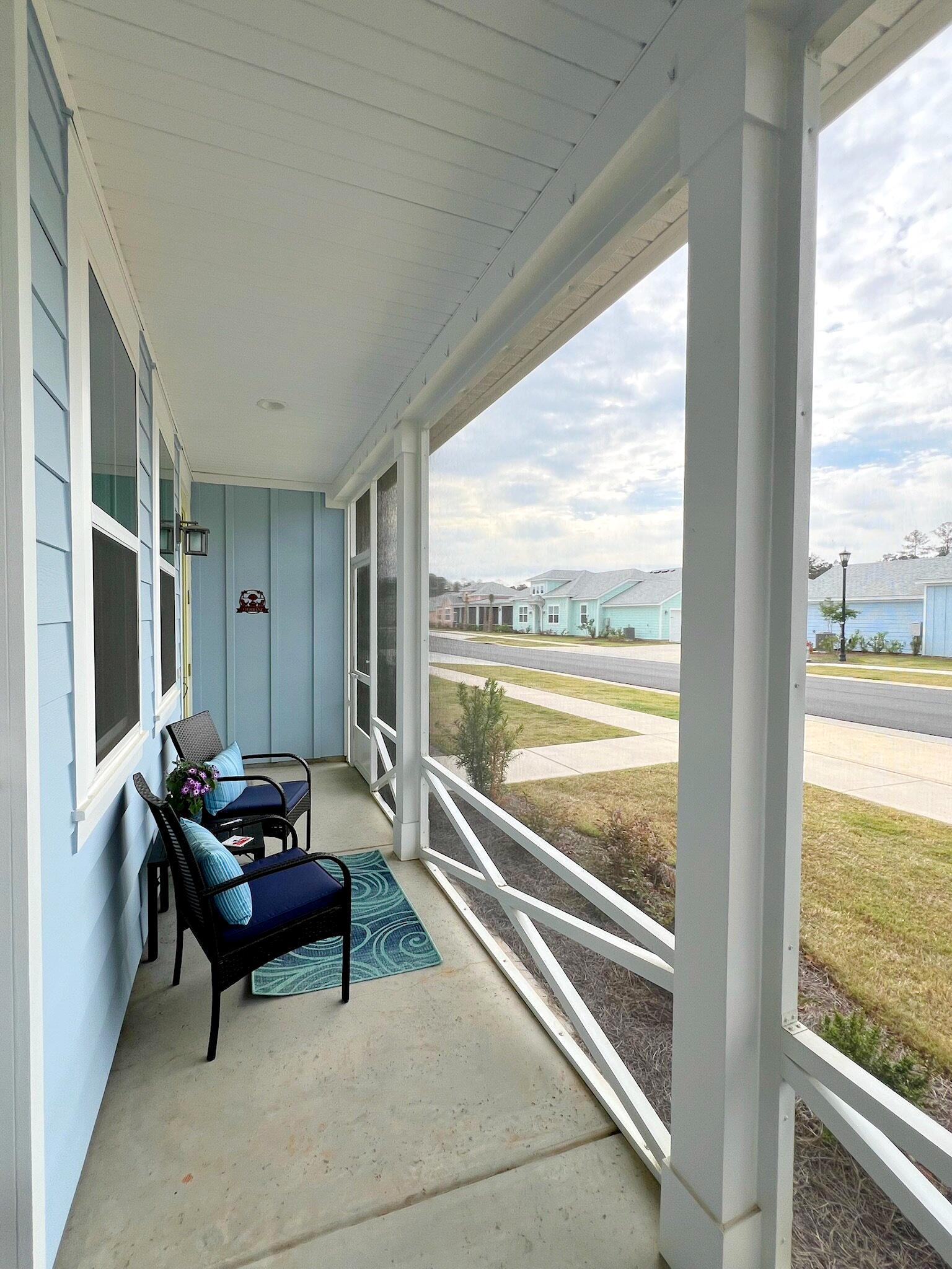 Our cottage is the Dreamsicle model, which provides 1,383 a/c sq. ft. (2,098 total sq. ft.). It has two bedrooms and two baths, an office/hobby room, laundry/mechanicals room, and an open floorplan consisting of a family room, kitchen and dining area. In addition to the open floorplan, the feature that drew us to this model is the L-shaped lanai, which we had screened in as an option during the construction process. Other options we added include upgraded gas appliances, beams on the family room ceiling to define the space, Mohawk laminate flooring throughout, quartz countertops, additional recessed lighting, and 8-foot doors. We had a local electrician install dimmers on our kitchen, dining room, family room, and lanai lighting. He also installed five ceiling fans and other lights for us.