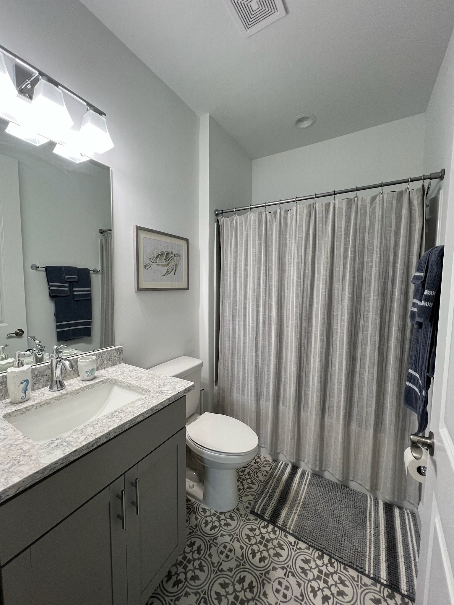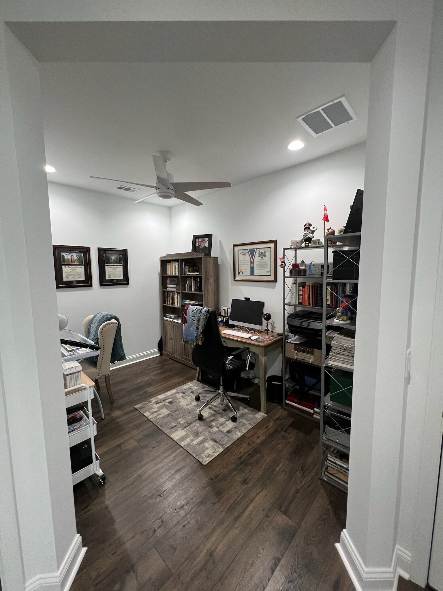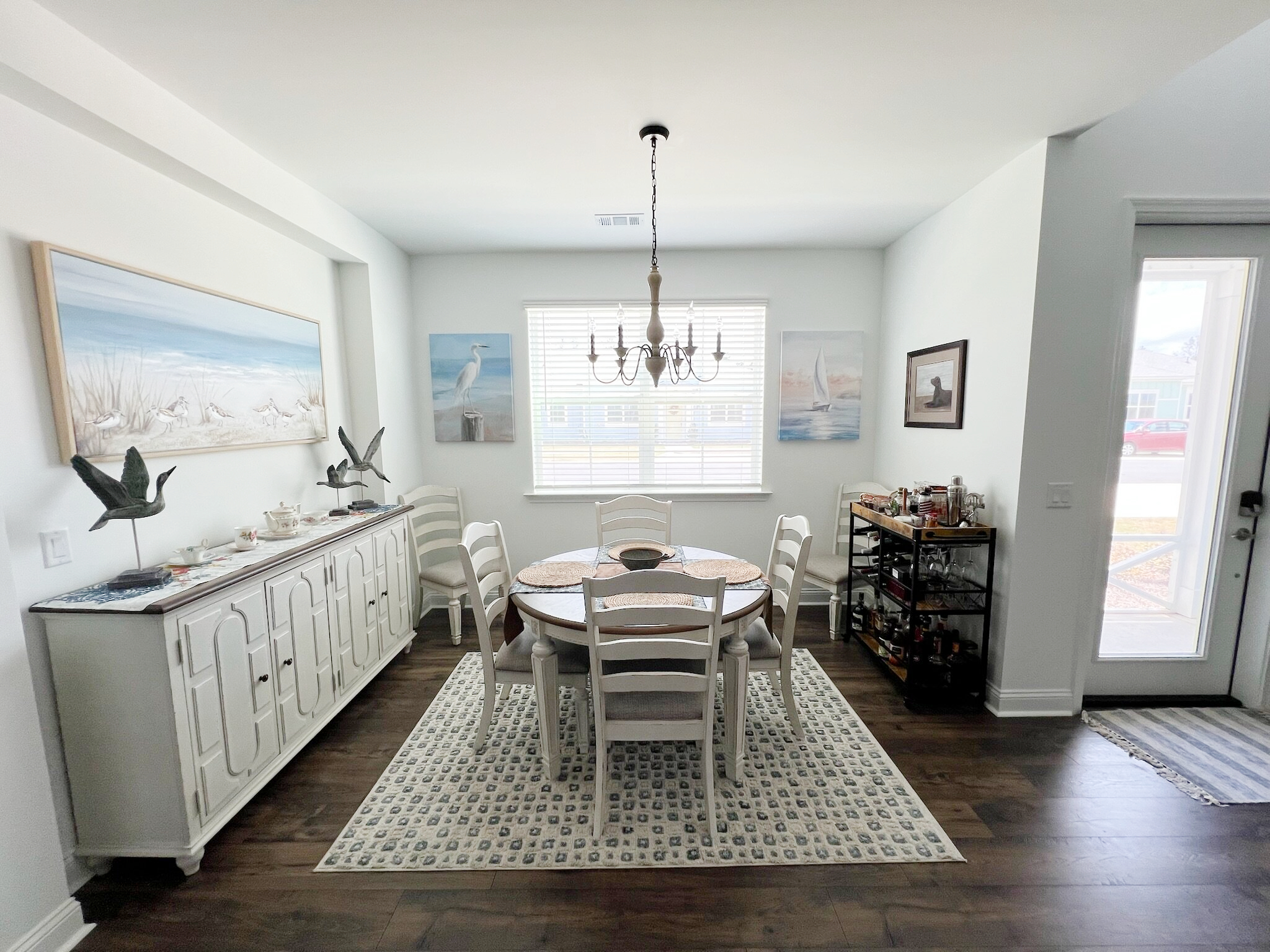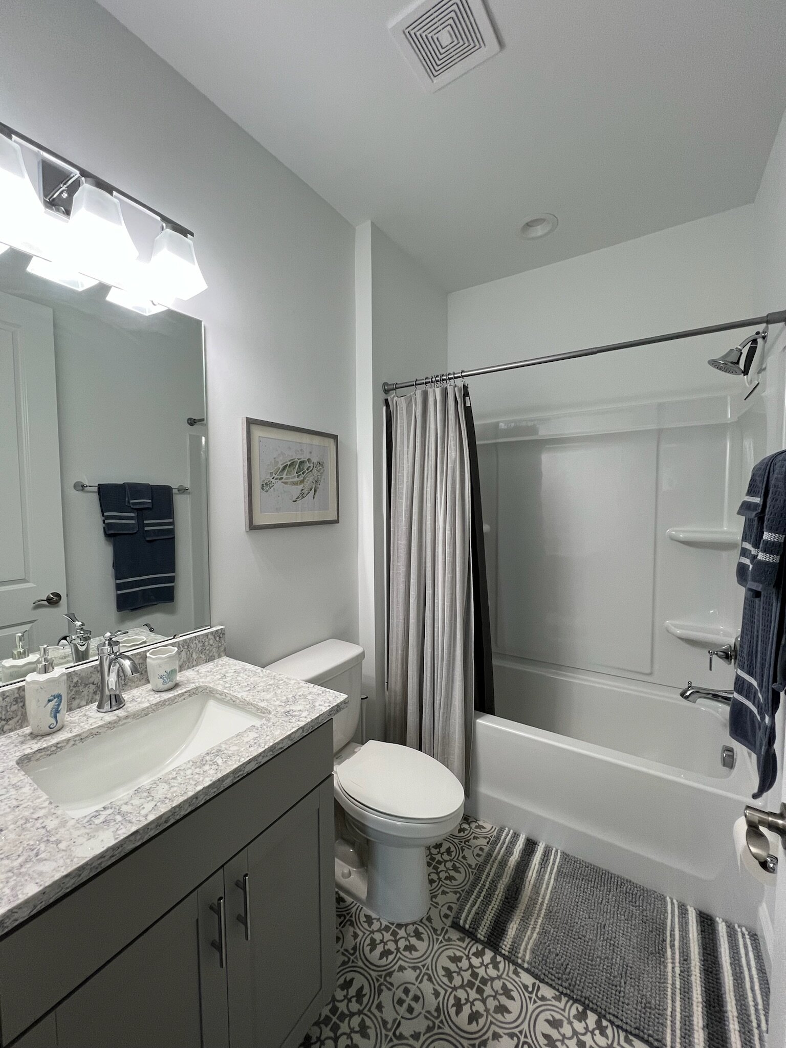 Our cottage is the Dreamsicle model, which provides 1,383 a/c sq. ft. (2,098 total sq. ft.). It has two bedrooms and two baths, an office/hobby room, laundry/mechanicals room, and an open floorplan consisting of a family room, kitchen and dining area. In addition to the open floorplan, the feature that drew us to this model is the L-shaped lanai, which we had screened in as an option during the construction process. Other options we added include upgraded gas appliances, beams on the family room ceiling to define the space, Mohawk laminate flooring throughout, quartz countertops, additional recessed lighting, and 8-foot doors. We had a local electrician install dimmers on our kitchen, dining room, family room, and lanai lighting. He also installed five ceiling fans and other lights for us.